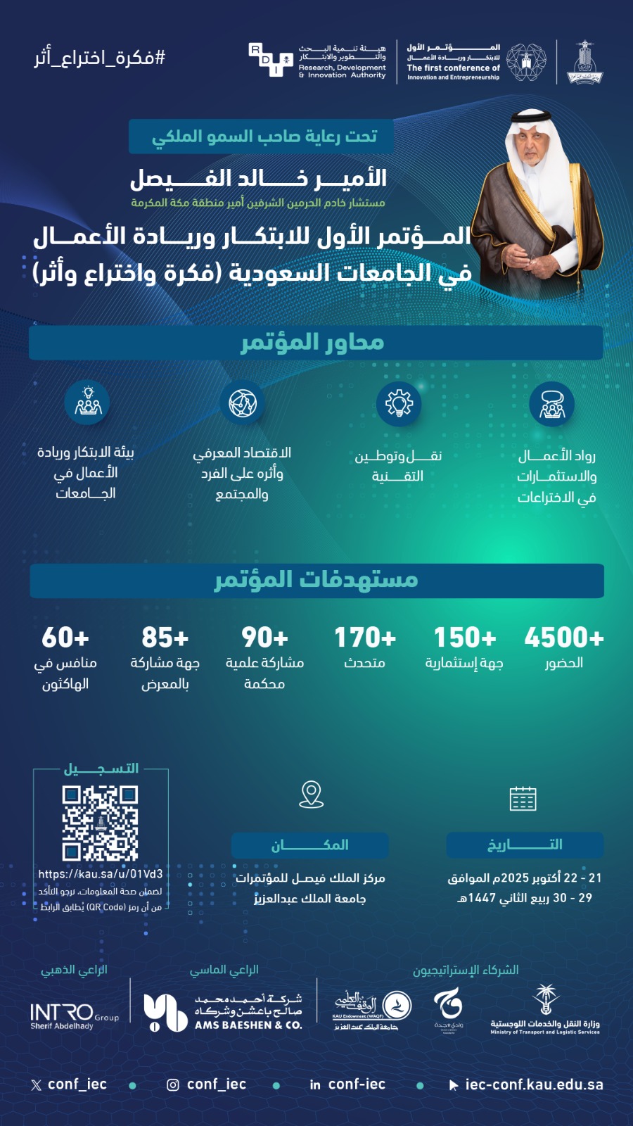 The First Conference on Innovation and Entrepreneurship in Saudi Universities is launched under the generous patronage of His Royal Highness Prince Khalid Al-Faisal, Advisor to the Custodian of the Two Holy Mosques and Governor of Makkah Region. The conference brings together a distinguished group of innovators, entrepreneurs, and academics in a national platform under the theme “Saudi Arabia: Idea, Invention, and Impact.”